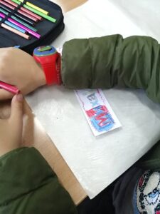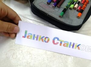 Na prvom času radionice poćeli smo sa upoznavanjem, tako što su deca izrazila svoju kreativnost i preciznost. Pokušala su i uspela da, na svoj individualan način, ukrase već napisano ime i prezime. Za bojenje su koristili drvene olovke. Tom prilikom su pokazala individualnu kreativnost, što je bio cilj uvodnog dela ove edukativno-kreativne radionice.